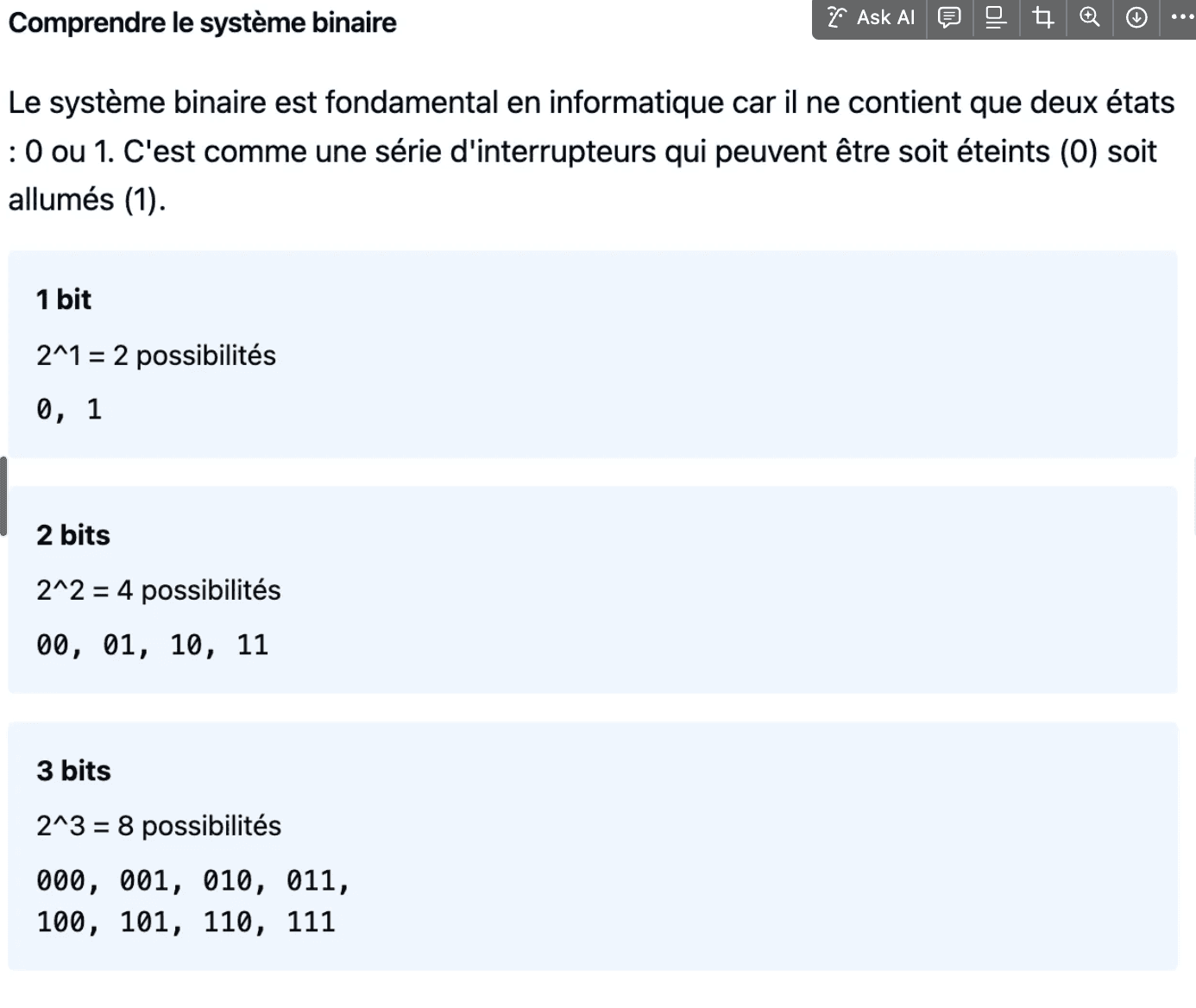 En informatique, tout est basé sur le système binaire, qui ne connaît que deux états : 0 ou 1. C'est comme avoir une série d'interrupteurs qui peuvent être soit éteints (0) soit allumés (1). Chaque position dans un nombre binaire double les possibilités :