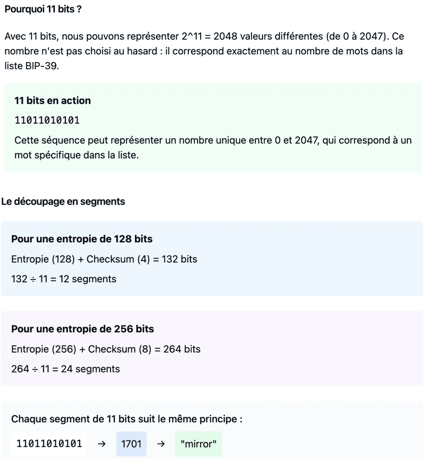 Ce système est remarquablement bien conçu car les mathématiques s'alignent parfaitement : le nombre de bits dans chaque segment (11) permet exactement le bon nombre de possibilités (2048) pour correspondre à notre liste de mots, et le nombre total de bits (avec le checksum) se divise toujours parfaitement par 11 pour donner un nombre entier de mots.