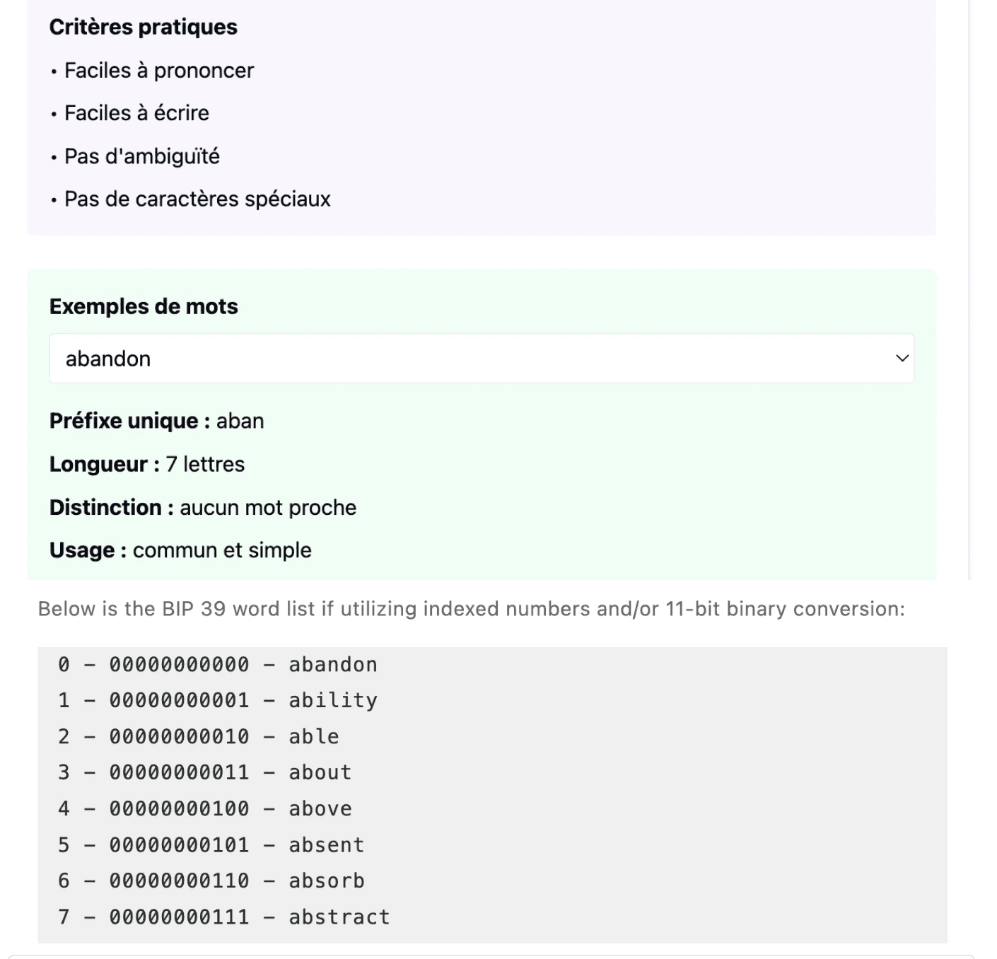 Ce système est particulièrement ingénieux car il nous permet de passer d'une séquence de bits (facile à manipuler pour un ordinateur) à un nombre décimal (plus facile à comprendre pour nous), qui pointe ensuite vers un mot mémorisable dans notre liste.