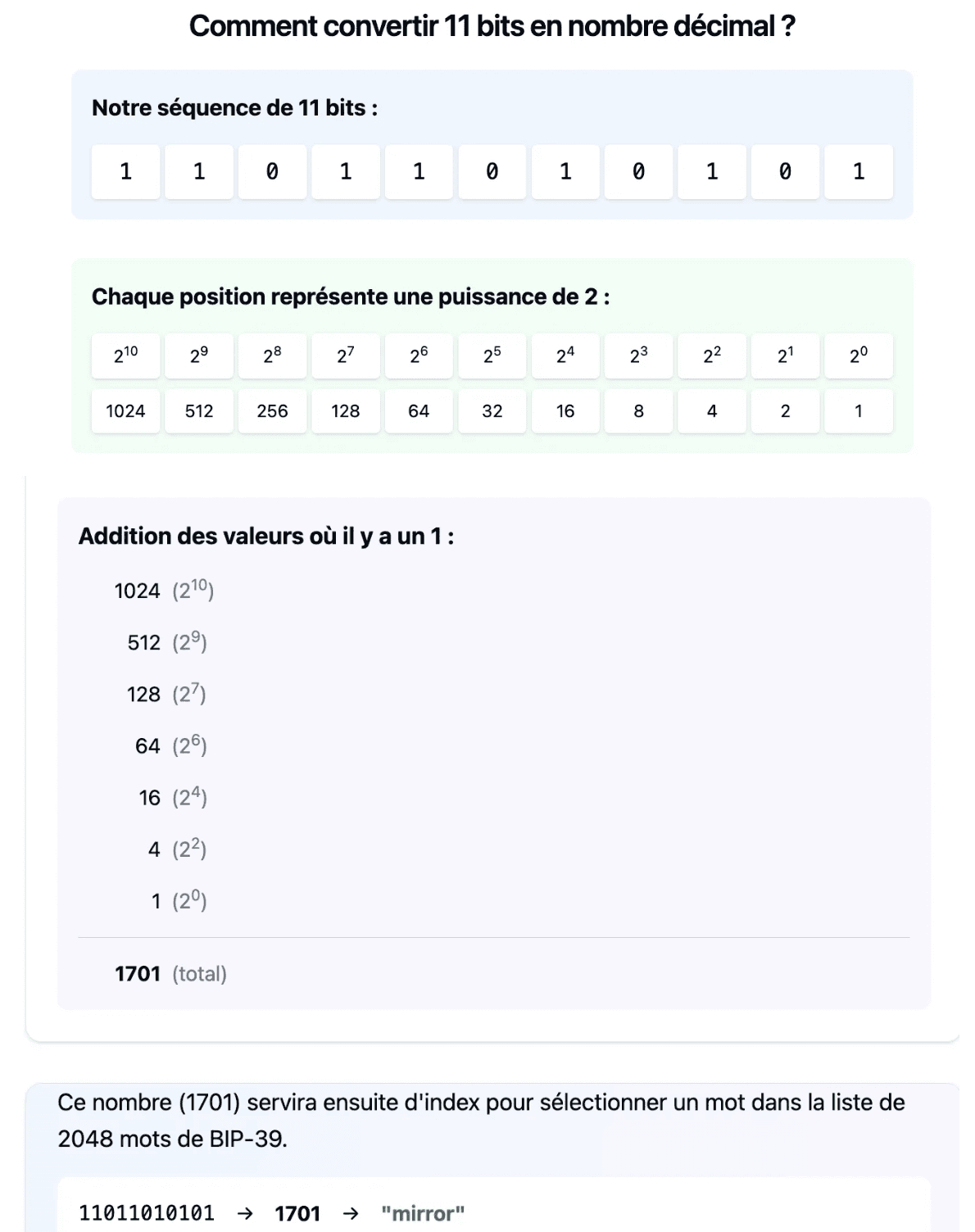 Cette conversion de binaire en décimal est fondamentale pour comprendre BIP-39.