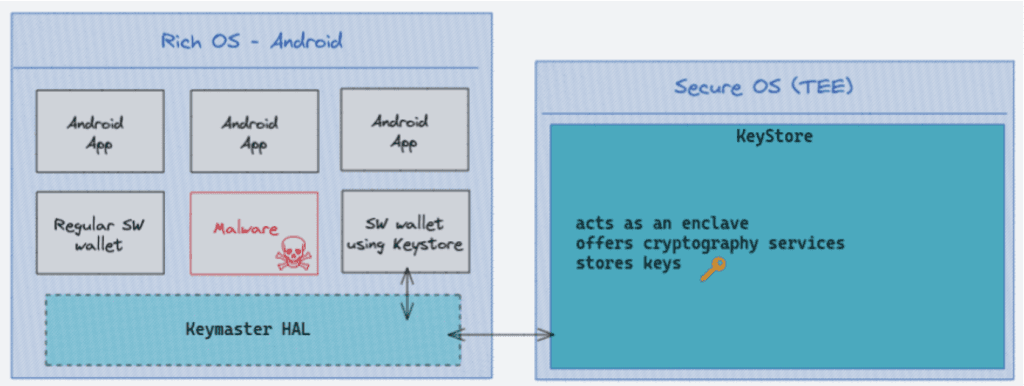 Les services de protection de clés (KeyStore, KeyChain) peuvent ajouter une couche de sécurité supplémentaire pour protéger les secrets au repos. Néanmoins, comme ils ne prennent pas en charge les algorithmes cryptographiques pour les applications de cryptomonnaie, la clé peut toujours être extraite.