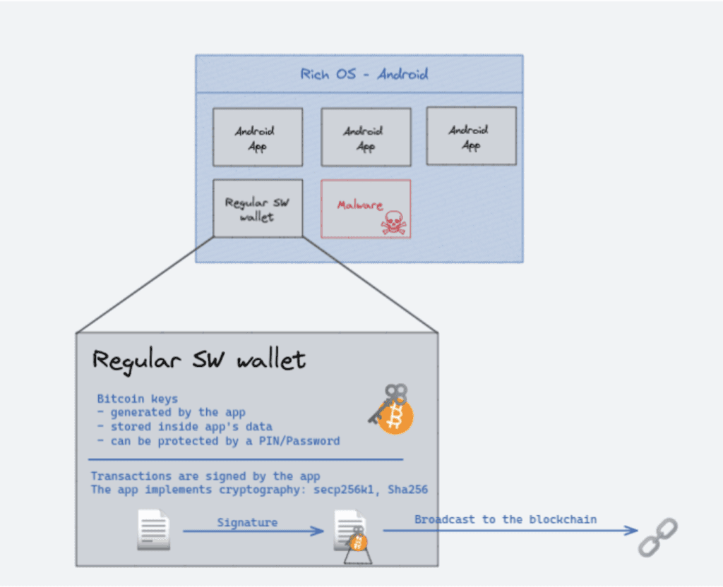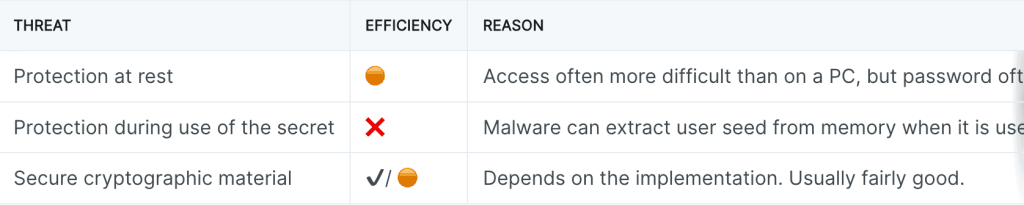 Le mécanisme d’isolation entre les applications fourni par iOS/Android élève la barre en matière de sécurité par rapport à un portefeuille logiciel exécuté sur un ordinateur. L’attaquant doit d’abord obtenir une élévation de privilèges pour accéder aux données de l’application. Cela est possible sur des appareils obsolètes. Des attaquants qualifiés (Ian Beer l’a fait en 6 mois seulement mais… c’est Ian Beer) peuvent également le faire sur des appareils récents et corrigés.